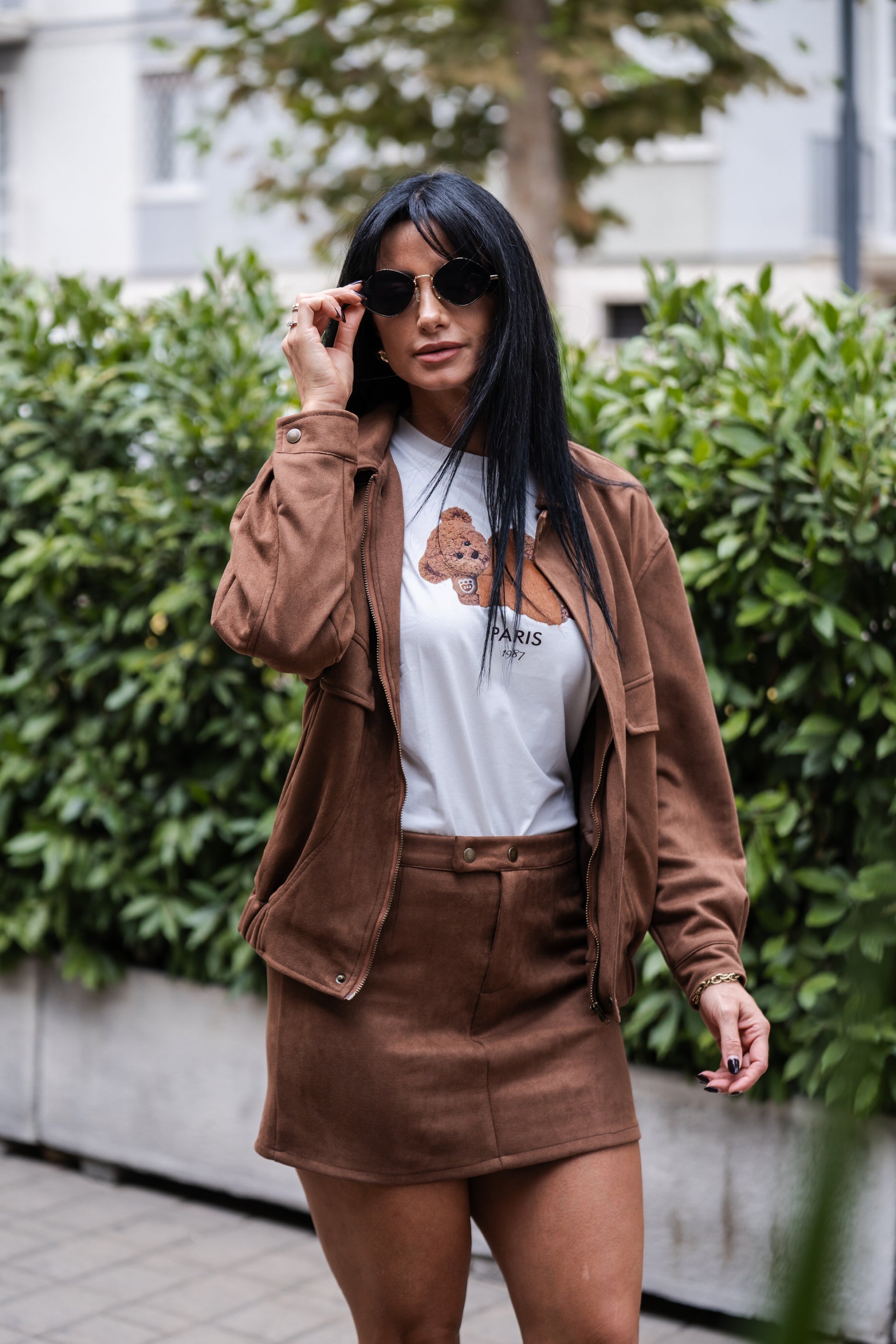 Lasciati avvolgere dall'atmosfera autunnale con il Completo Caramello. Con il suo mood caramello e la texture in camoscio, è perfetto per creare uno stile elegante e di tendenza. Versatile e caldo, è un must-have per questa stagione. Da abbinare con stivali o sneakers per un effetto wow senza sforzo.