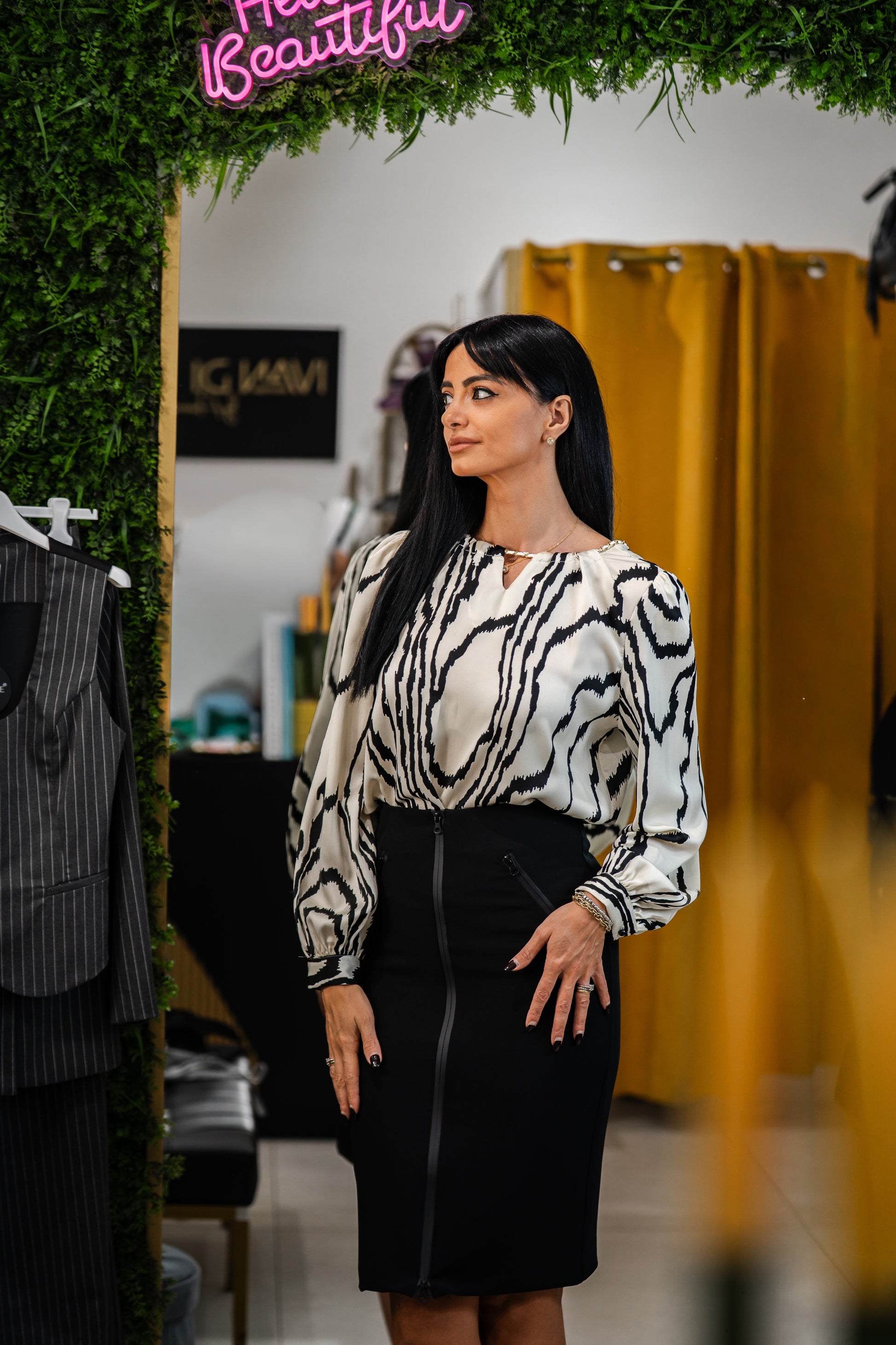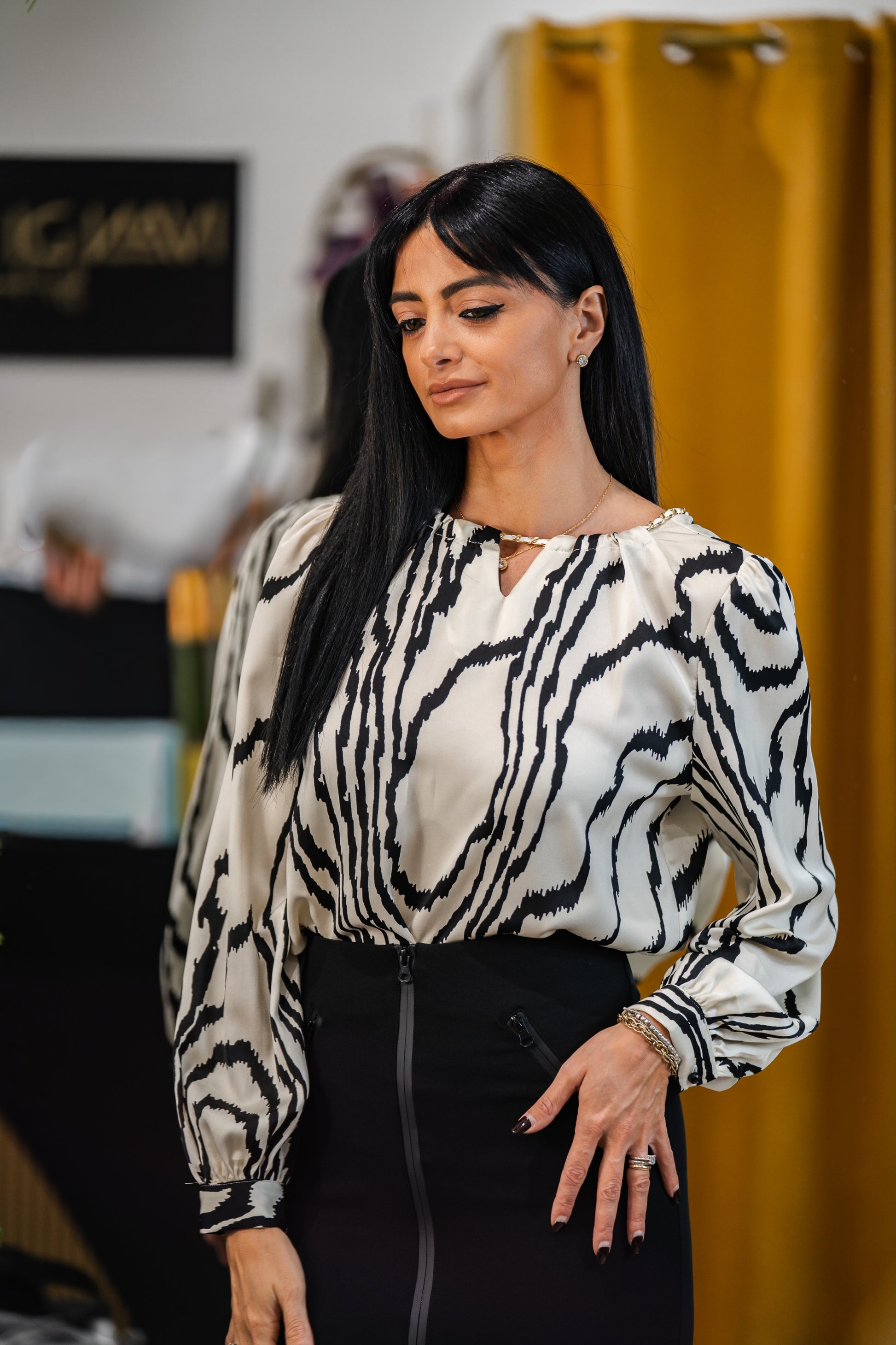 La Maglia Blusa Satin Fantasia KLN è elegante e di alta qualità. Realizzata in raso satinato, presenta una fantasiosa fantasia e un raffinato giro gola. L'applicazione di catena sulla scollatura aggiunge un tocco di glamour. Perfetta per un look sofisticato e di classe.