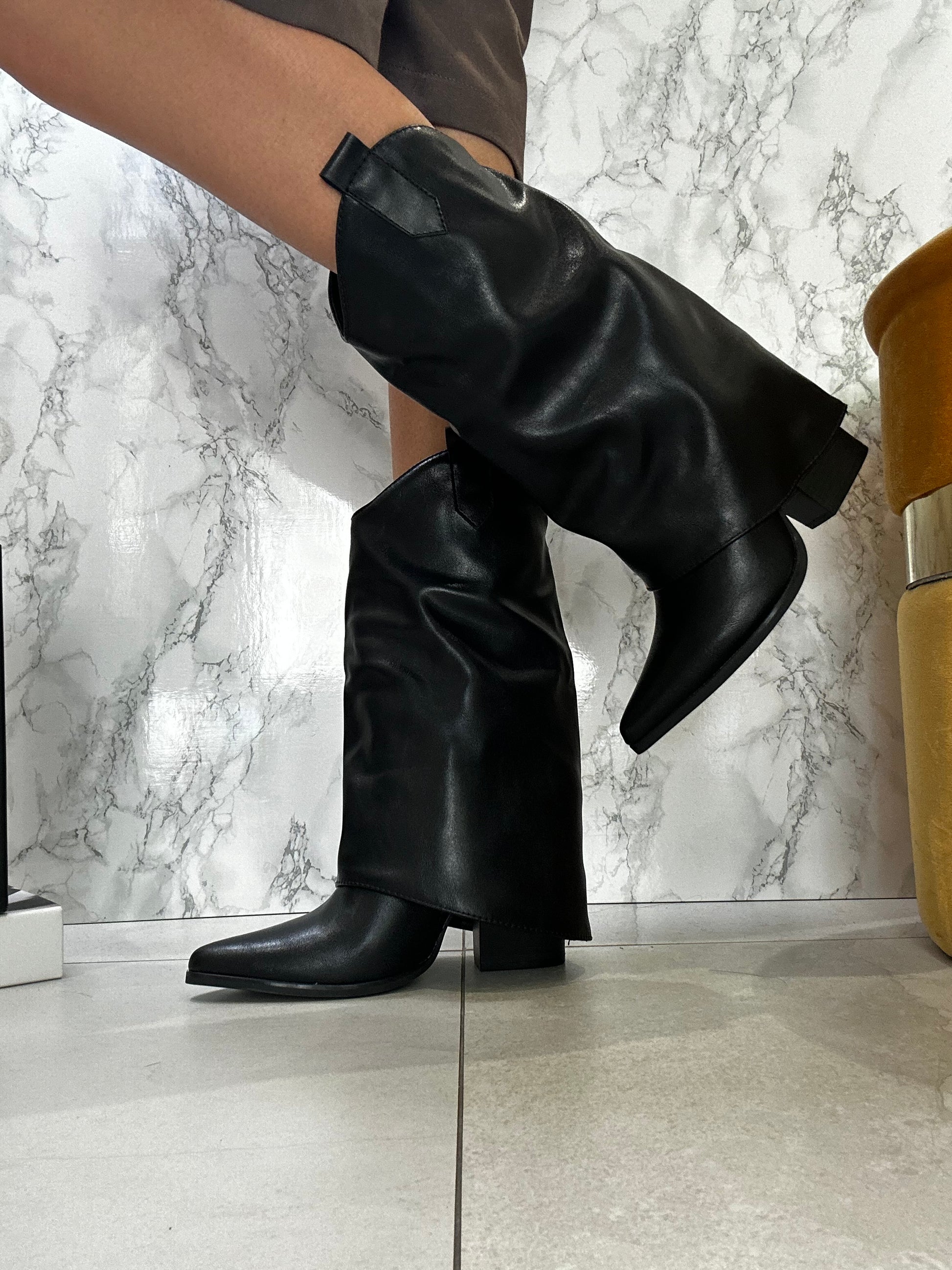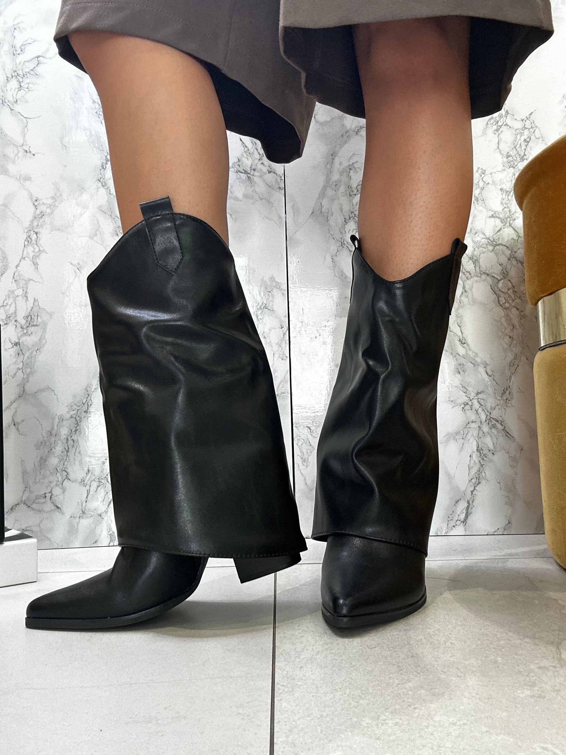 Questi stivali camperos sono realizzati in pelle e presentano un elegante risvolto che li rende versatili per molteplici occasioni. Il tacco doppio alto 9 cm garantisce comfort e stile, mentre l'effetto pelle conferisce un tocco di classe in più. Indossali per un look di tendenza con un tocco di femminilità.