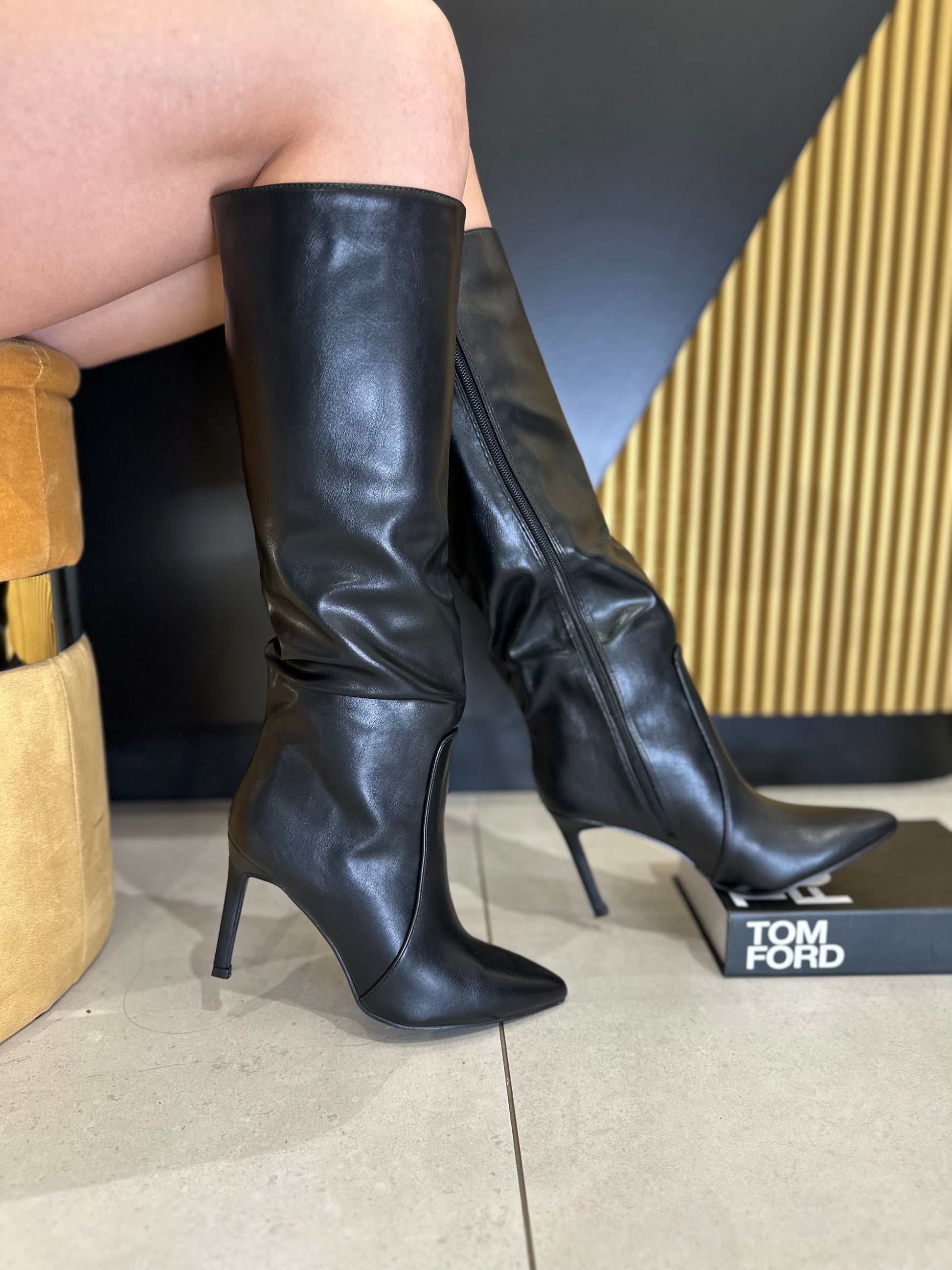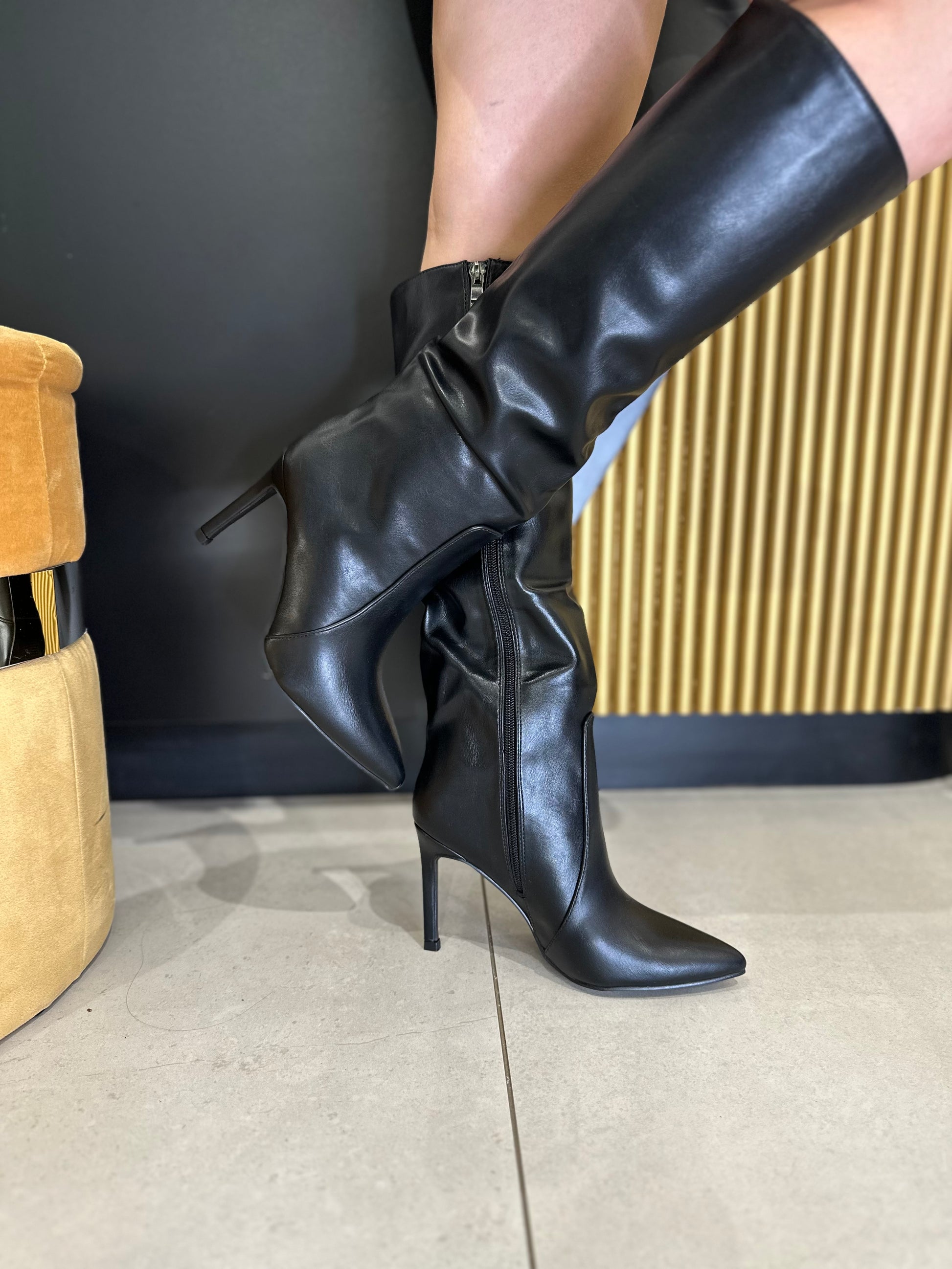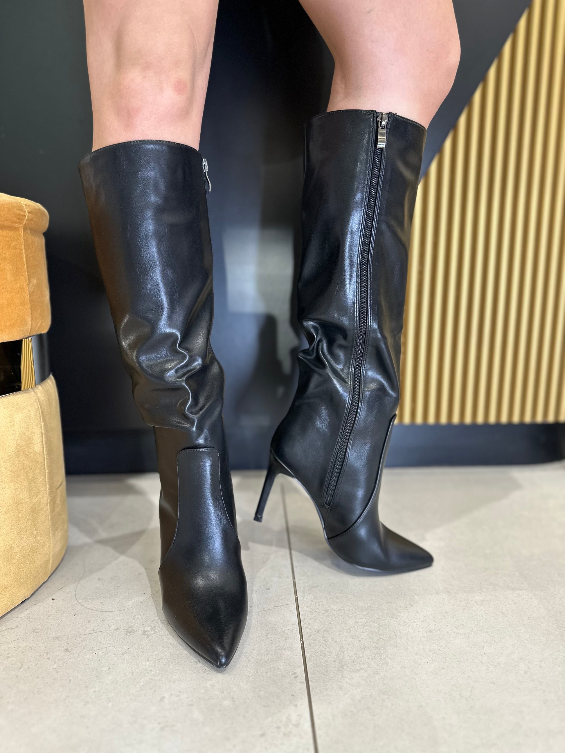 Stivali, effetto pelle tacco a spillo, alto 9 cm, chiusura con cerniera interna.