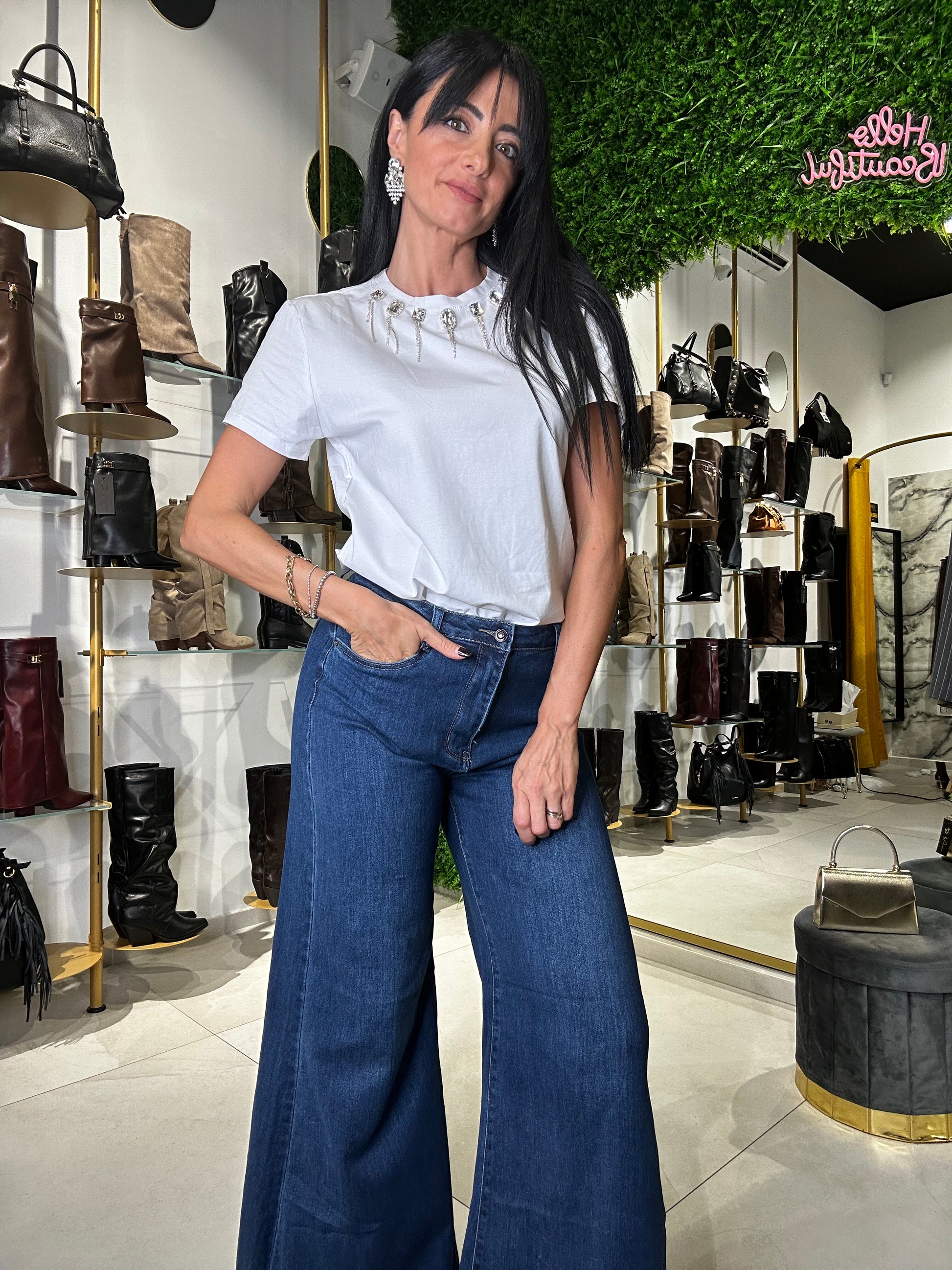 La maglietta Diamonds, in cotone al 100%, è un capo unico e di alta qualità, interamente prodotto in Italia. La sua particolarità? Un'affascinante girocollo impreziosito da applicazioni luminose bianche, che donano un tocco elegante e raffinato al look. Ti sentirai come se indossassi una collana, ma con tutto il comfort di una maglietta.